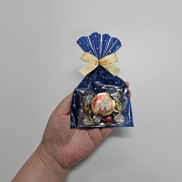 上品なシャンパンゴールドのリボンが魅力。華やかなラッピングにカラフルなチョコを詰めました。